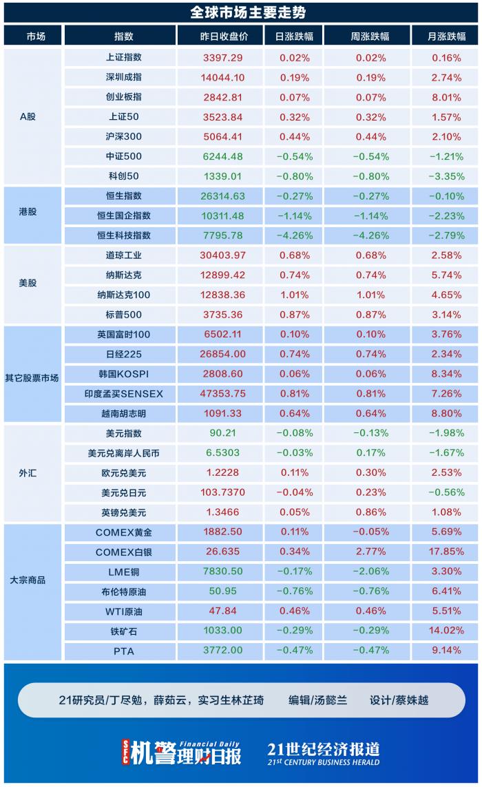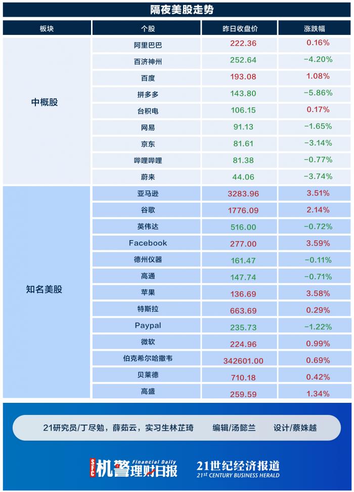 美股方面,道琼斯工业指数、纳斯达克指数、标普500指数均收涨。知名美股中,亚马孙上涨3.51%,谷歌上涨2.14%,苹果上涨3.58%,Facebook上涨3.59% 。