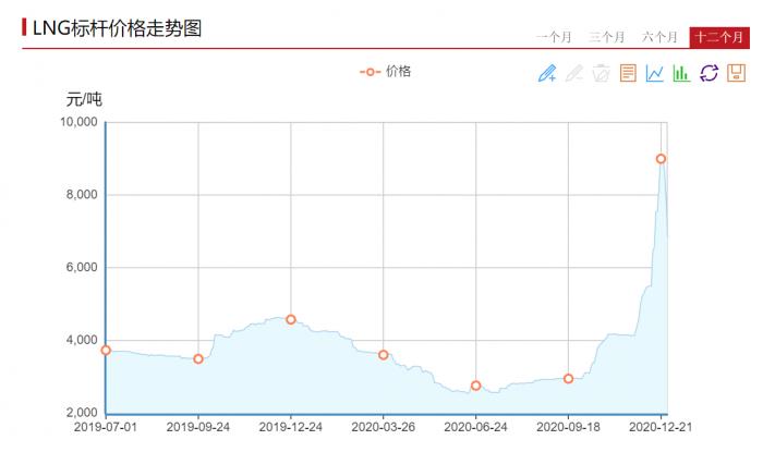 自今年6月以来,十二月份以来,LNG(液化天然气)价格就从底部启动,进入12月后更是出现一波快速冲高,一度接近1万元/吨价格,是6月最低价的近4倍(数据来源:卓创资讯)。LNG价格的飞涨,与供需矛盾有关。这段时间里,终端需求不断上升,同时上游不断压减供应量,导致各地气源出现严重短缺,为保障下游客户供气,使得燃气公司大量采购高价LNG进行补充。