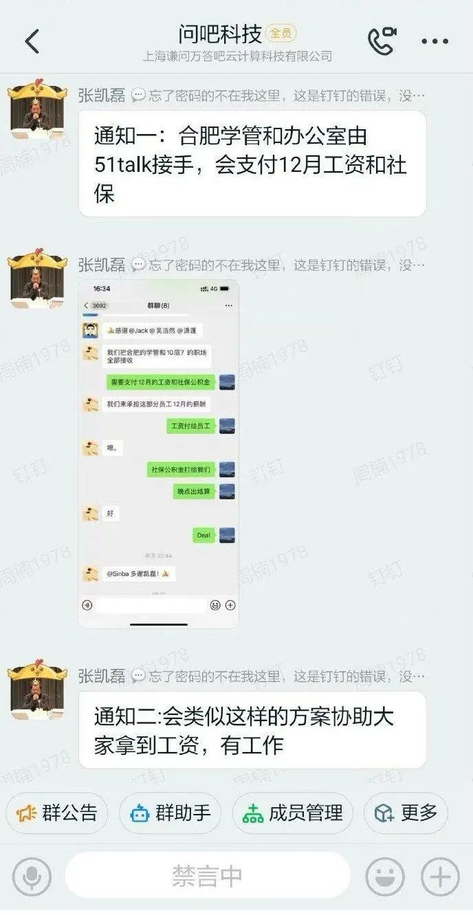 张凯磊曾在一个显示为“问吧科技”的群聊天中发出通知称,“合肥学管和办公室由51talk接手,会支付12月工资和社保。”亦有媒体曝出,合肥销售团队由作业帮接手。