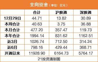 北向资金全天合计净买入44.71亿元,其中沪股通净买入13.83亿元,深股通净买入30.89亿元。