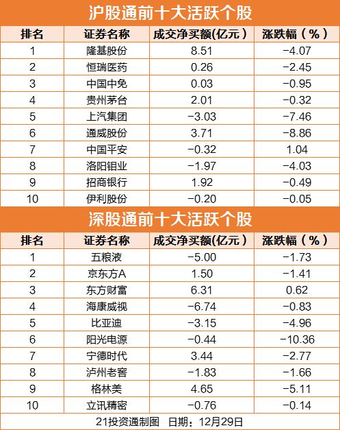 十大活跃个股方面,隆基股份净买入8.51亿,东方财富净买入6.31亿,格林美净买入4.65亿,通威股份净买入3.71亿。海康威视净卖出6.74亿,五粮液净卖出5亿,比亚迪净卖出3.15亿,上汽集团净卖出3.03亿。