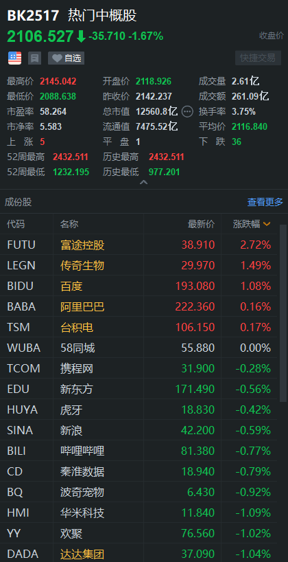 知名中概股中:阿里巴巴涨0.16%;百度涨1.08%;京东跌3.41%;网易跌1.65%;新浪微博跌13.5%;拼多多跌5.86%;蔚来跌3.74%;小鹏汽车跌9.22%;理想汽车跌7.88%;哔哩哔哩跌0.77%。
