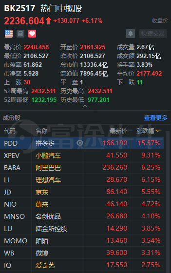 知名中概股中:拼多多涨15.57%,阿里巴巴涨6.25%,小鹏汽车涨9.31%,名创优品涨4.1%,陌陌涨3.54%,逸仙电商涨1.54%,哔哩哔哩涨1.31%;