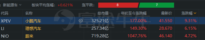 小鹏汽车(XPEV.US)涨超9%,理想涨超6%,蔚来涨超4%。
