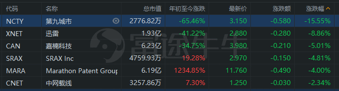 区块链概念股周二普遍回调,此前在周一纷纷大涨。第九城市(NCTY.US)跌超15%、嘉楠耘智跌超5%、迅雷跌超8%。