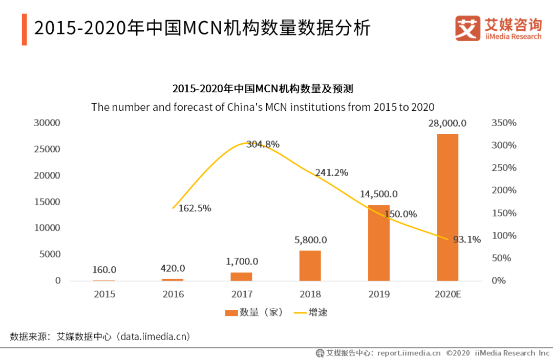 作为内容产业的新兴环节,中国MCN行业自2017年出现了爆发式增长,2017年前后也是MCN行业的融资元年。近年来MCN机构数量从数百家量级猛涨到上万家量级,预计到2020年,中国MCN机构数量将达到28000家。