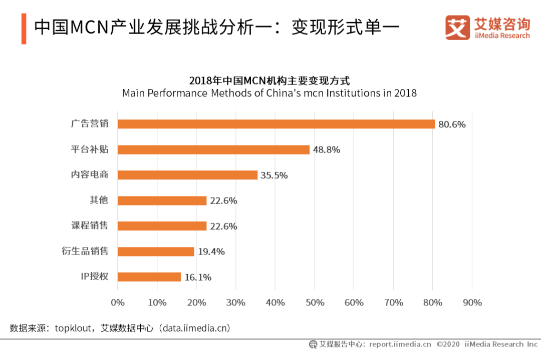 目前MCN机构主要商业变现形式是广告营销和平台补贴,广告营收是大头,主流变现形式单一。艾媒咨询分析师认为,MCN机构的商业价值很大程度上来说是分割了品牌商在互联网的一部分投放资金,但品牌商广告投放主阵地是在电视媒体,加上近年来电梯广告的冲击,互联网投放广告的比例并不乐观。未来,多渠道探索商业变现形式是MCN发展的出路之一。