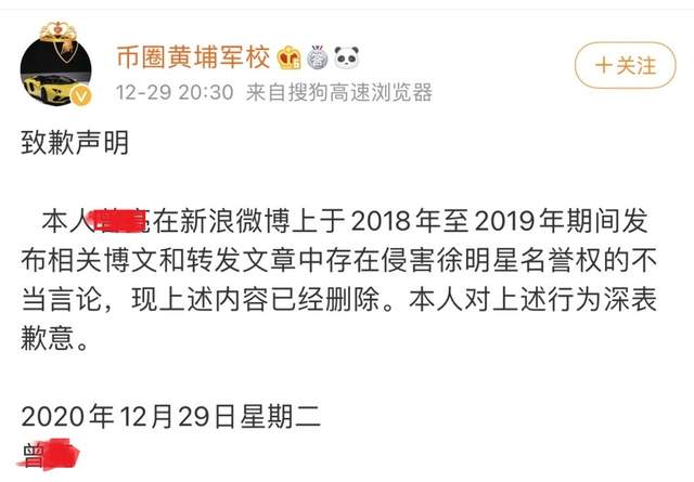 互联网博主曾某,在2018年至2019年一年多的时间里,在新浪微博上发布了大量关于币圈大佬徐明星的侵权言论,最终遭到起诉,法院最终判令曾某删除侵权言论并公开致歉、赔偿。