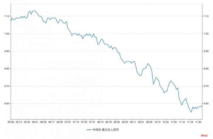 12月30日,人民币兑美元报6.5325,较前一日调升126个基点。自11月17日报6.5762,人民币兑美元中间价一直维持在6.5关口。同日,在岸人民币兑美元开盘报6.5319,离岸人民币兑美元开盘报6.5165,较昨日收盘价均有小幅上涨。