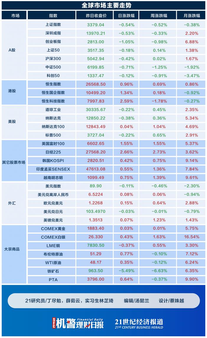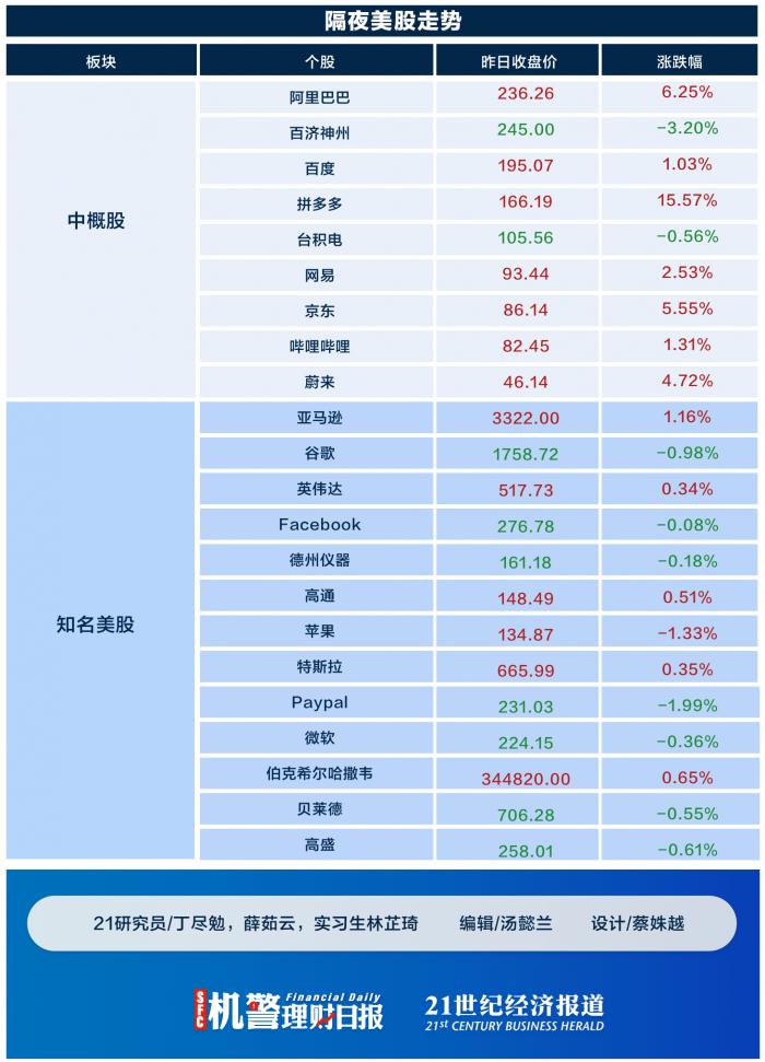 美股方面,三大指数小幅下跌。其中,道琼斯工业下跌0.22%,纳斯达克下跌0.38%,标普500下跌0.22%。值得注意的是,中概股拼多多大幅上涨15.57%,报收166.19美元,总市值突破2000亿美元;阿里巴巴触底反弹,报收236.26美元,涨幅6.25% ,总市值回到6000亿美元以上。