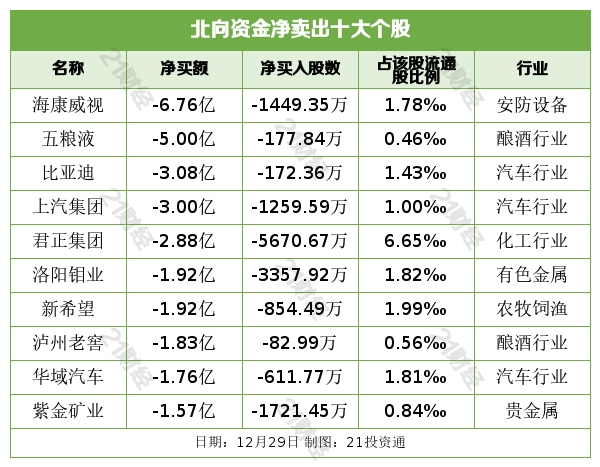 北向资金净卖出海康威视(002415.SZ)、五粮液(000858.SZ)、比亚迪(002594.SZ)、上汽集团(600104.SH)、君正集团(601216.SH)居前,净卖出额分别为:6.76亿元、5亿元、3.08亿元、3亿元、2.88亿元。