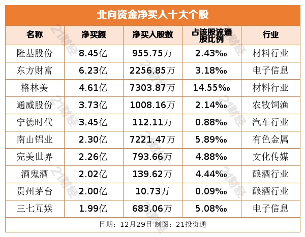 个股方面,北向资金净买入隆基股份(601012.SH)、东方财富(300059.SZ)、格林美(002340.SZ)、通威股份(600438.SH)、宁德时代(300750.SZ)居前,净买入额分别为:8.45亿元、6.23亿元、4.61亿元、3.73亿元、3.45亿元。