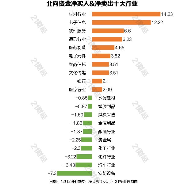 从净买入金额来看,北向资金共增持37个行业,其中材料行业居首,净买入金额达14.23亿元,其次是电子信息,净买入12.22亿元。
