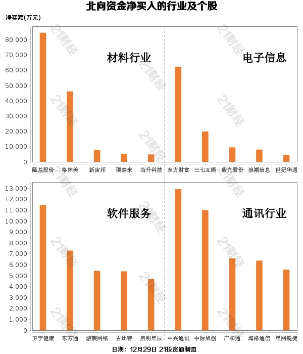 据21投资通智能监测,12月29日,A股三大指数集体收跌,北向资金逆势净买入44.71亿元,其中沪股通净买入13.83亿元,深股通净买入30.89亿元。