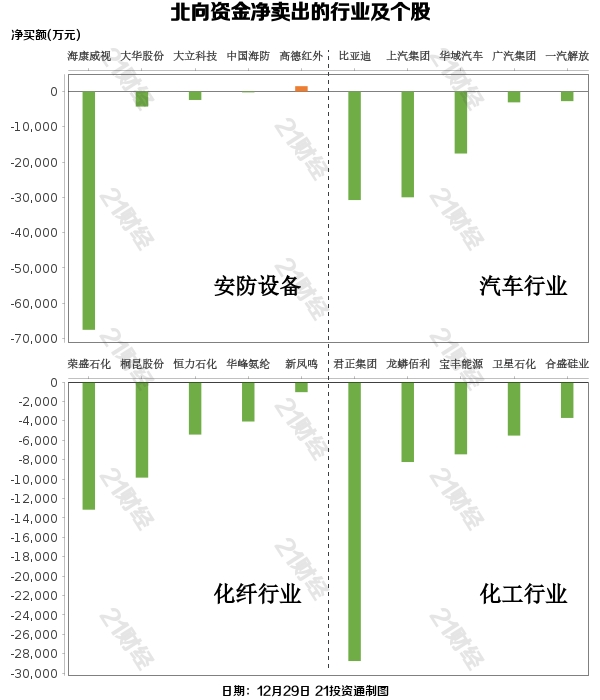 北向资金共减持23个行业,其中安防设备最多,净卖出金额达7.30亿元,其次是汽车,净卖出3.43亿元。