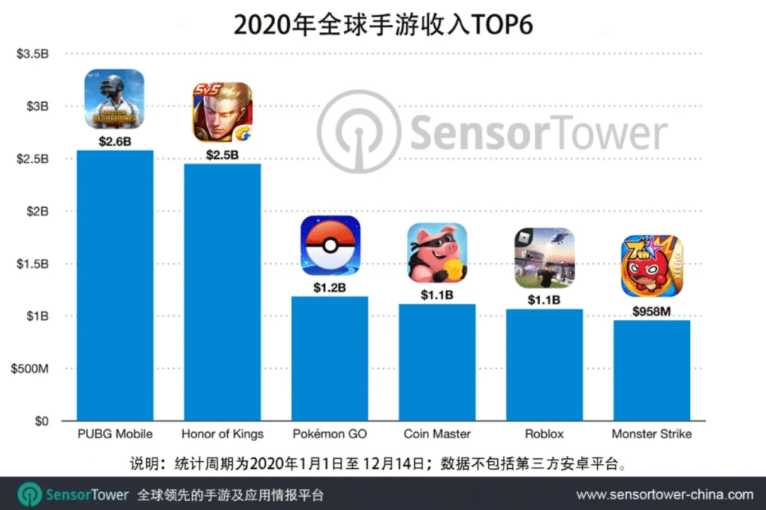 根据Sensor Tower商店情报数据显示,2020年至今,以腾讯《和平精英》和《PUBG Mobile》,《王者荣耀》为首的五款手游收入已经突破10亿美元。其中,腾讯的《和平精英》和《PUBG Mobile》(Sensor Tower将两个游戏的收入进入了打包计算)位居榜首,全球收入约为26亿美元,同比增长64.3%;位列第二的是《王者荣耀》,全球收入约为25亿美元,同比增长42.8%;排名第三的是Niantic的《Pokémon GO》,全球收入约为12亿美元,较2019年增长31.5%;排名第四的则是以色列游戏厂商Moon Active推出的《Coin Master》,全球收入约为11亿美元,是去年的两倍;最后一位是来自San Mateo的沙盒游戏《Roblox》,2020年移动端收入逼近11亿美元,较2019年增长近一倍。