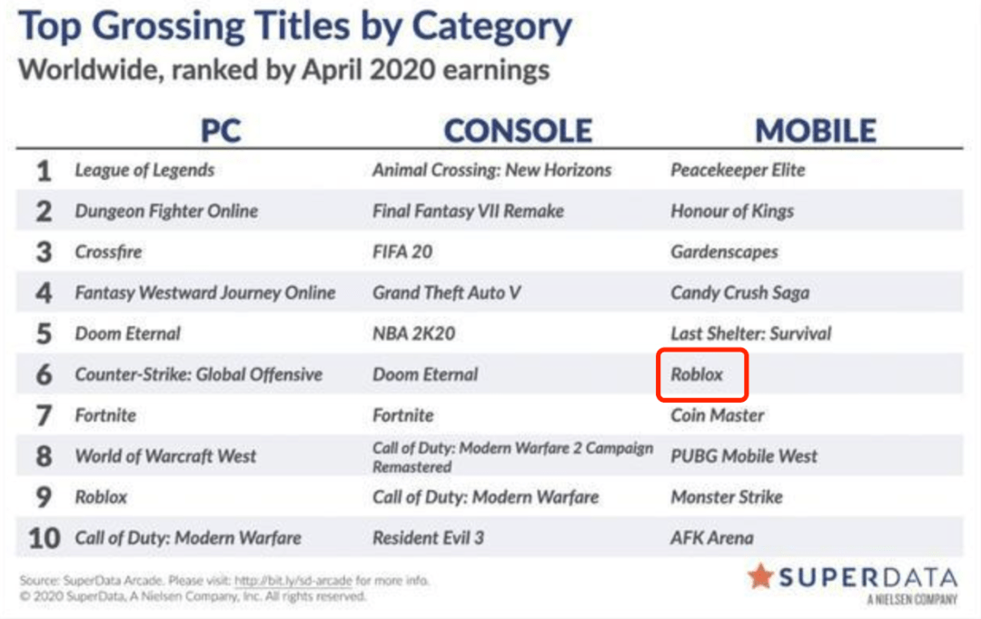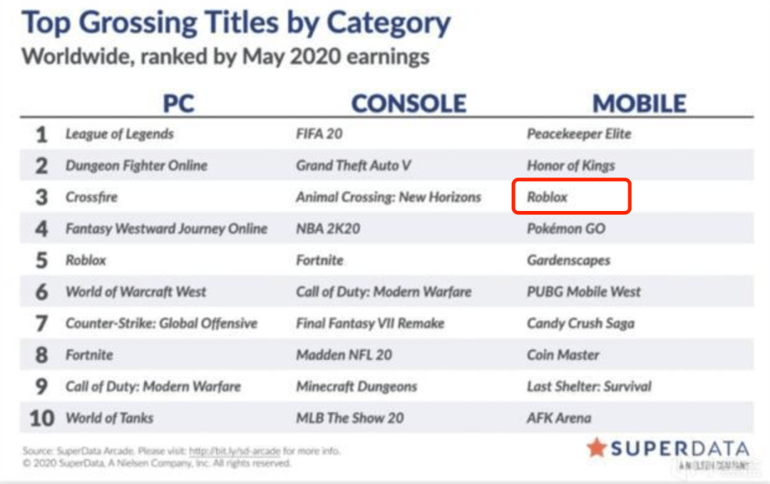 根据美国市场研究公司Superdata统计,在2020年1月的时候,Roblox的收入排在全球移动游戏市场第九的位置,到了4月上升到第六,5月上升到第三,可谓是日进斗金。
