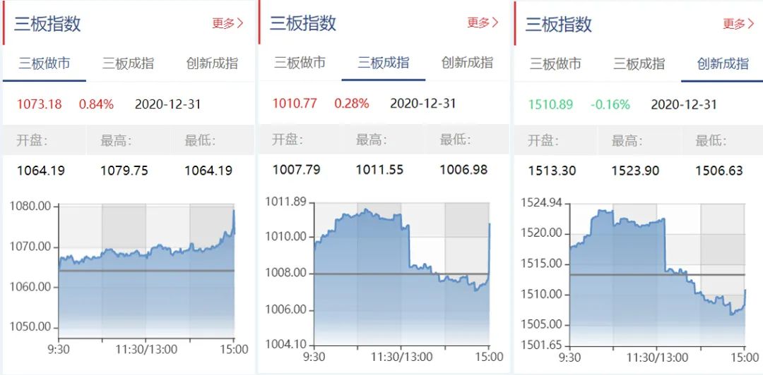 截至12月31日收盘,三板做市报1073.18点,下跌0.84%;三板成指报1010.77点,上涨0.28%;三板创新成指报1510.89点,下跌0.16%。