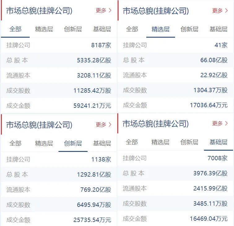新三板挂牌公司总计8187家(精选层41家,创新层1138家,基础层7008家),总股本5335.28亿股,流通股本3208.11亿股。