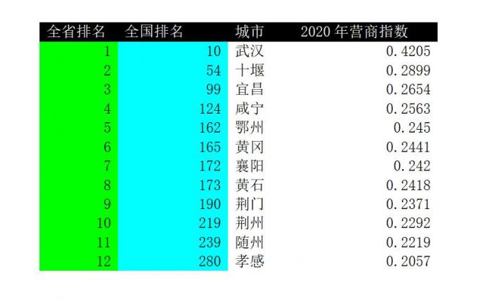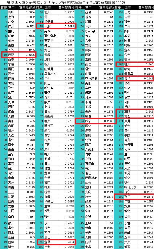 根据2020年12月粤港澳大湾区研究院、21世纪经济研究院发布的296个城市营商环境报告,2020年湖北营商环境最好的城市是武汉,位居全国第10名。十堰、宜昌分别位居全国第54、第99名,全省第2、第3名。另外咸宁、鄂州、黄冈、襄阳、黄石、荆门也分别进入到了全国两百强。