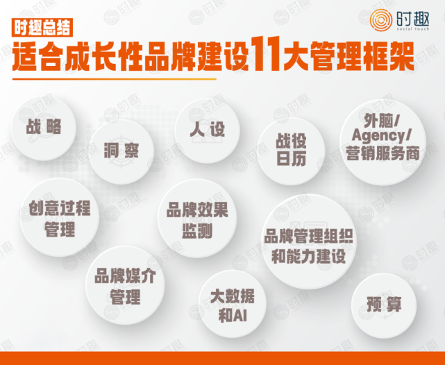 如今,传播环境的巨变、消费者偏好的变化,都导致诸如“定位+VI+大曝光”等传统品牌营销打法已经失灵,时趣通过长期对中国营销的经验总结,构建了适合成长性品牌建设的11大管理框架,可供参考:
