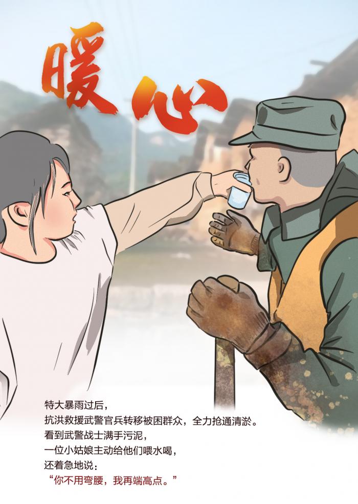 抗洪救援,小姑娘踮起脚尖给武警官兵喂水喝。