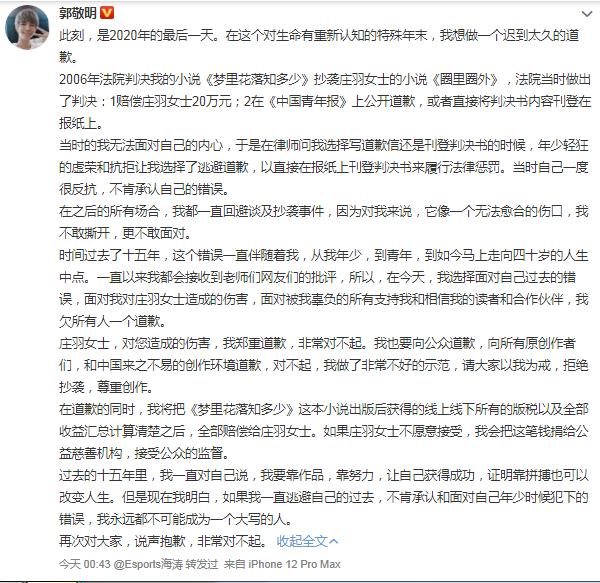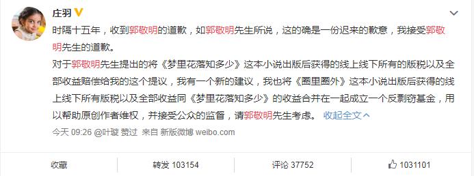 郭敬明在文中就当年小说《梦里花落知多少》抄袭庄羽的作品《圈里圈外》一事在微博上道歉,并表示将把《梦里花落知多少》的版权收入全部赔偿给庄羽女士,“如果庄羽女士不愿意接受,我会把这笔钱捐给公益慈善机构”。