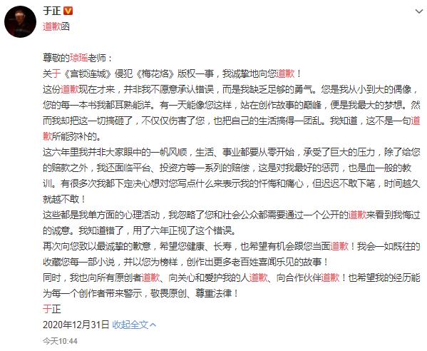 继郭敬明就抄袭一事道歉后,于正也在微博就《宫锁连城》侵犯《梅花烙》版权一事向琼瑶道歉。