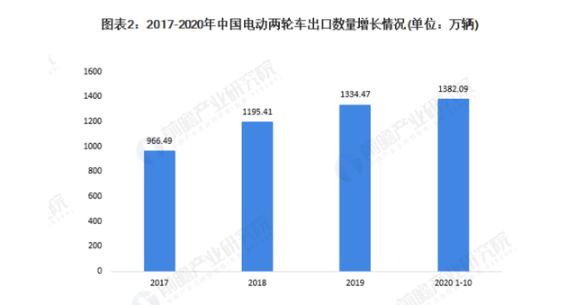 不过,中国作为世界上最大的电动自行车生产、消费和出口国,国内外需求的持续增长为我国电动自行车行业迎来发展机遇。相关数据显示,在出口方面,2017-2020年,我国电动两轮车的出口数量逐年增长,2020年1-10月,出口数量已达2019年全年水平,共出口了1382.09万辆,表明我国电动两轮车的外贸出口市场增长强劲。