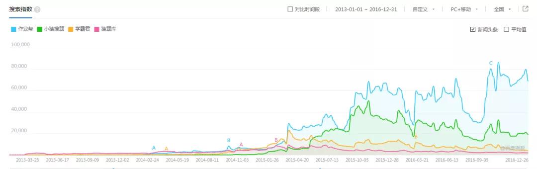 工具类在线教育企业,顾名思义,就是通过工具软件,切入在线教育市场的企业。猿辅导、学霸君、作业帮,这三家毫无疑问都是工具类在线教育企业。根据百度搜索指数来看,三家企业的工具类软件产品在2015年左右大众关注度开始上升。