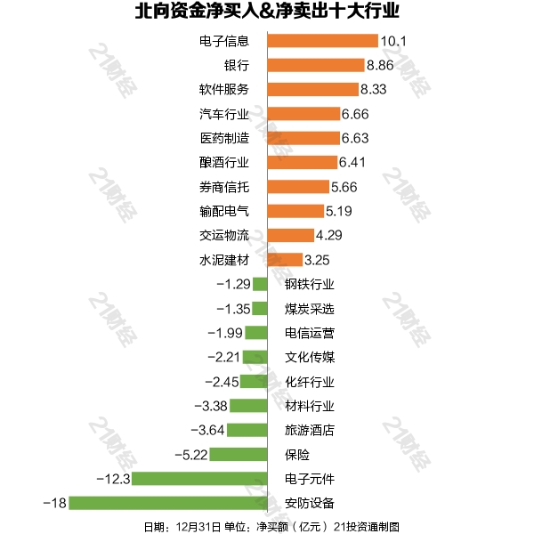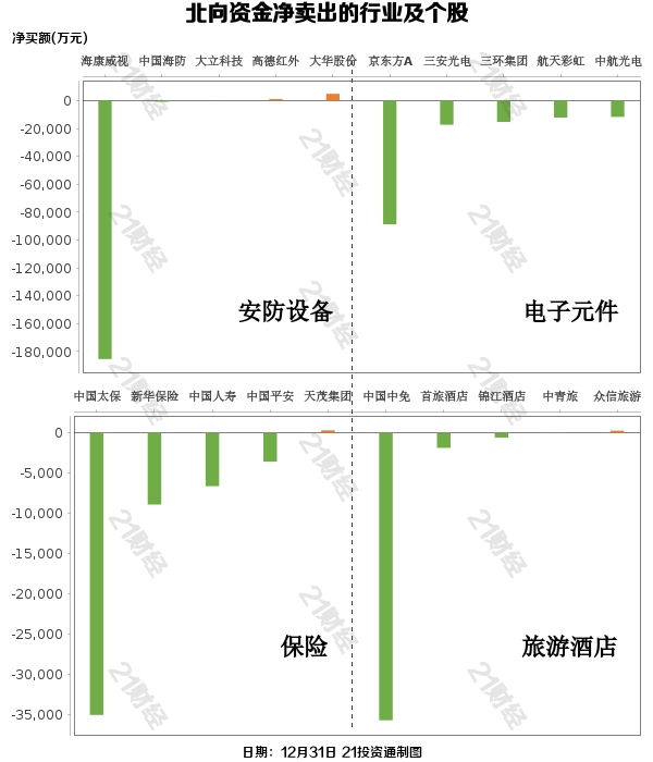 北向资金减持了20个行业,其中安防设备最多,净卖出金额达18.00亿元,其次是电子元件行业,净卖出12.30亿元。