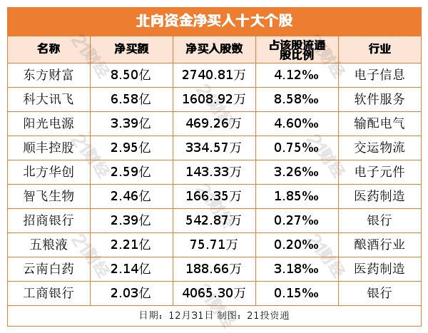 个股方面,北向资金净买入东方财富(300059.SZ)、科大讯飞(002230.SZ)、阳光电源(300274.SZ)、顺丰控股(002352.SZ)、北方华创(002371.SZ)居前,其中,东方财富被净买入8.50亿元,科大讯飞被净买入6.58亿元,阳光电源被净买入3.39亿元,顺丰控股被净买入2.95亿元,北方华创被净买入2.59亿元。