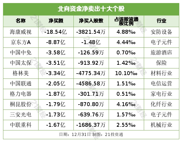此外,京东方A(000725.SZ)、中国中免(601888.SH)、中国太保(601601.SH)、格林美(002340.SZ)居前,京东方A被净卖出8.87亿元,中国中免被净卖出3.58亿元,中国太保被净卖出3.51亿元,格林美被净卖出3.34亿元。