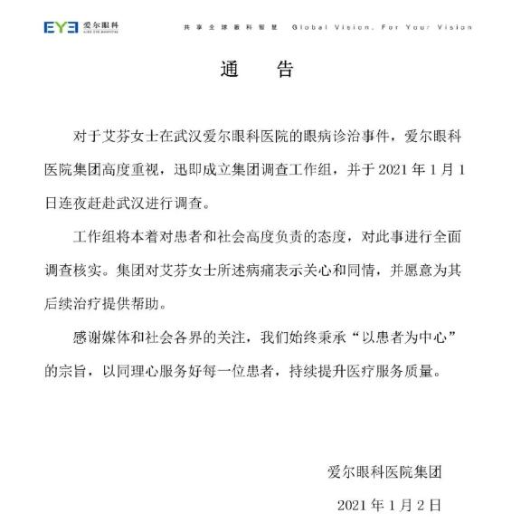 启信宝显示,武汉爱尔眼科是爱尔眼科(300015.SZ)旗下全资子公司。2021年1月2日,爱尔眼科微信公众号发布通告称,对于艾芬女士在武汉爱尔眼科医院的眼病诊治事件,爱尔眼科医院集团高度重视,迅即成立集团调查工作组,并于2021年1月1日连夜赶赴武汉进行调查。工作组将本着对患者和社会高度负责的态度,对此事进行全面调查核实。集团对艾芬女士所述病痛表示关心和同情,并愿意为其后续治疗提供帮助。