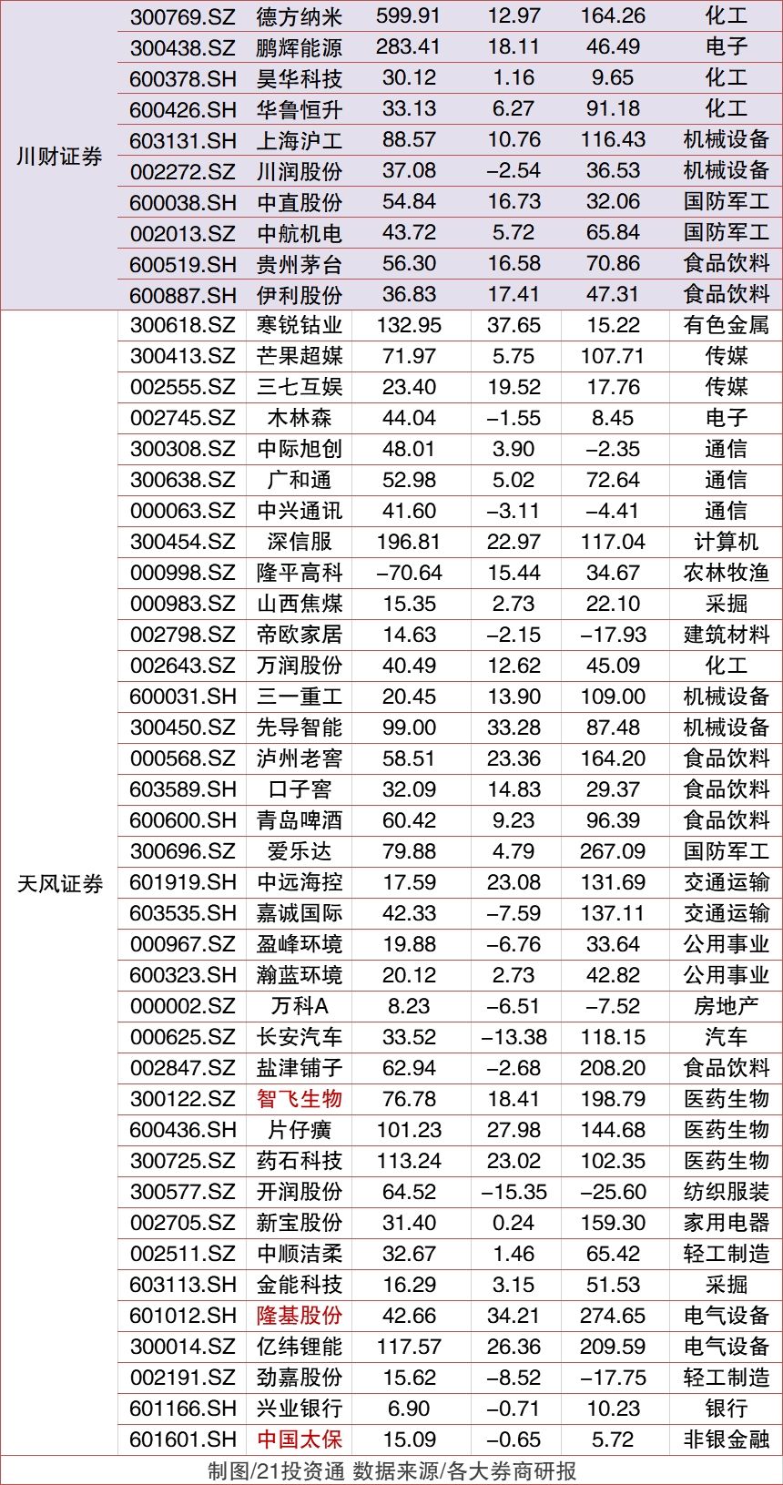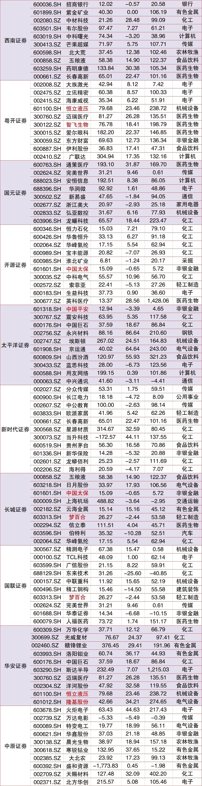 据21投资通不完全统计,中国太保(601601.SH)被4家券商同时推荐,恒立液压(601100.SH)、隆基股份(601012.SH)、梦百合(603313.SH)、智飞生物(300122.SZ)、中国平安(601318.SH)也被3家券商同时推荐。