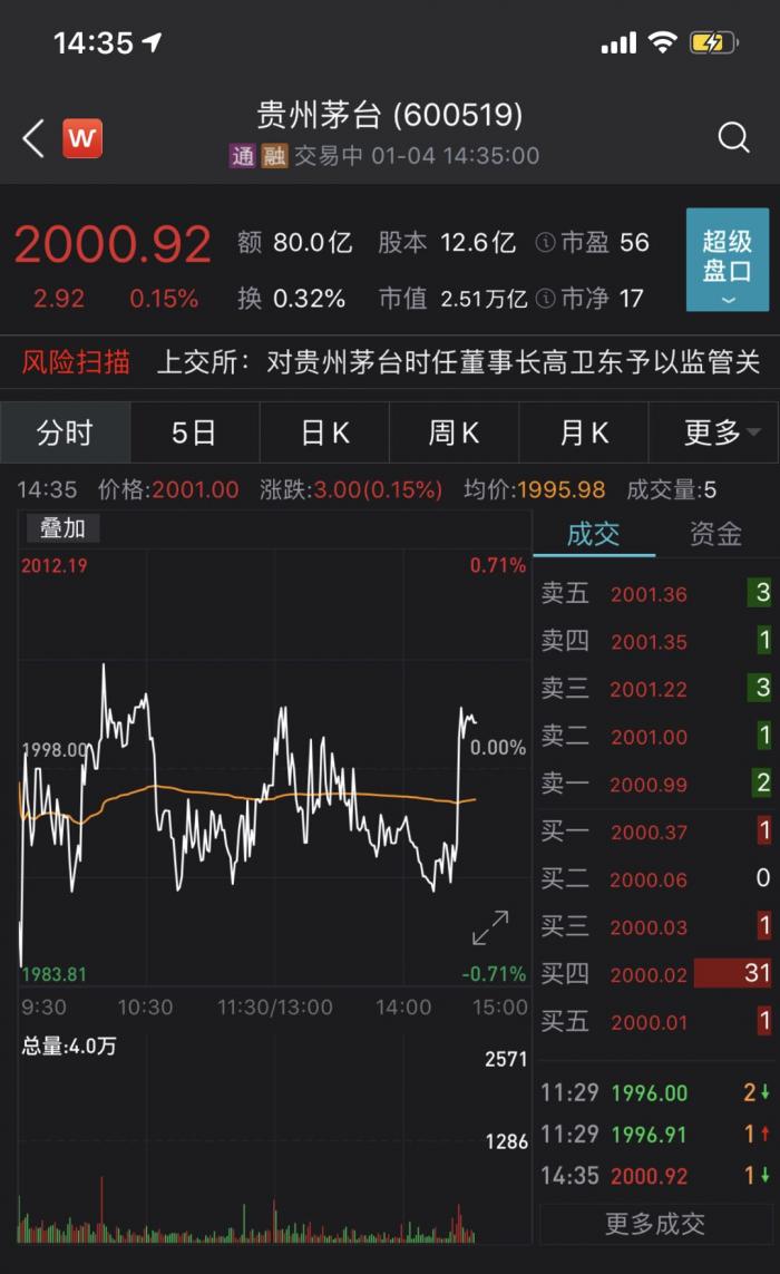 新年首个交易日,贵州茅台早盘突破2000元大关,再创历史新高,随后保持震荡走势。