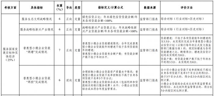 服务国家发展目标和实体经济包括服务生态文明战略情况、服务战略性新兴产业情况、普惠型小微企业贷 款“两增”完成情况、普惠型小微企业贷款“两控”完成情况4项二级指标,权重分别为6%、6%、7%、6%,主要反映商业银行服务国家宏观战略、服务实体经济、服务微观经济情况。