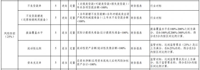 风险防控包括不良贷款率、不良贷款增速、拨备覆盖水平、流动性比例、资本充足率5项二级指标,权重均为5%,主要反映商业银行资产管理和风险防控水平。