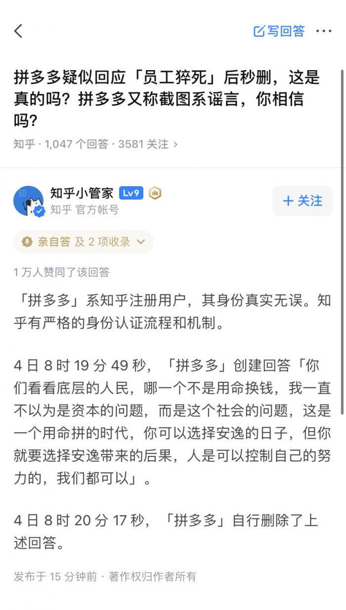 针对拼多多称截图系谣言,知乎回应称,「拼多多」系知乎注册用户,其身份真实无误。知乎有严格的身份认证流程和机制。