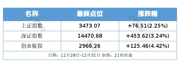 元旦假期前,上周四A股市场高开高走、大幅震荡上扬,沪指再创年内新高3474点。沪指一周累涨2.25%,深证成指累涨3.24%,创业板指累涨4.42%。