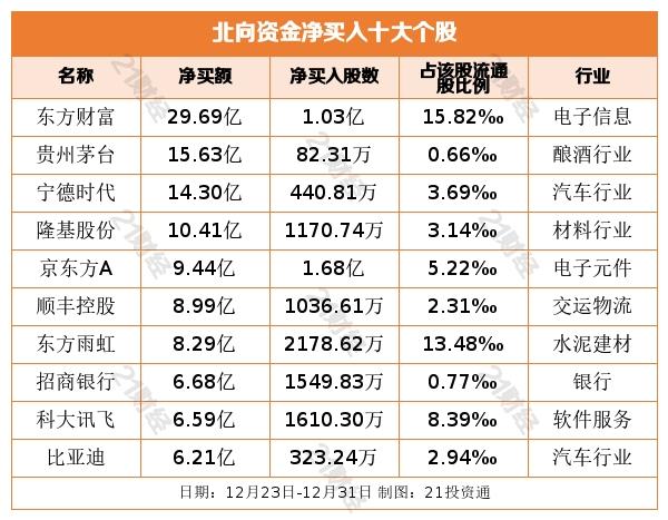 据21投资通智能监测,在2020年最后5个有沪深港通交易的交易日中,北向资金合计净买入179.2亿元,其中沪股通净买入51.82亿元,深股通净买入127.39亿元。