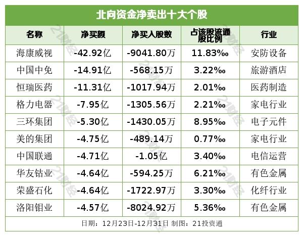 其中,安防龙头海康威视过去5个交易日被净卖出42.92亿元。事实上,北向资金已连续一个多月抛售海康威视,持股比例从11月24日的6.77%减持至12月31日的4.16%,减持比例达2.61%,减持近四成股份。