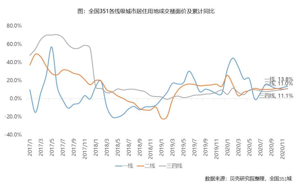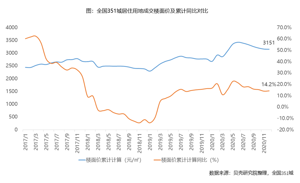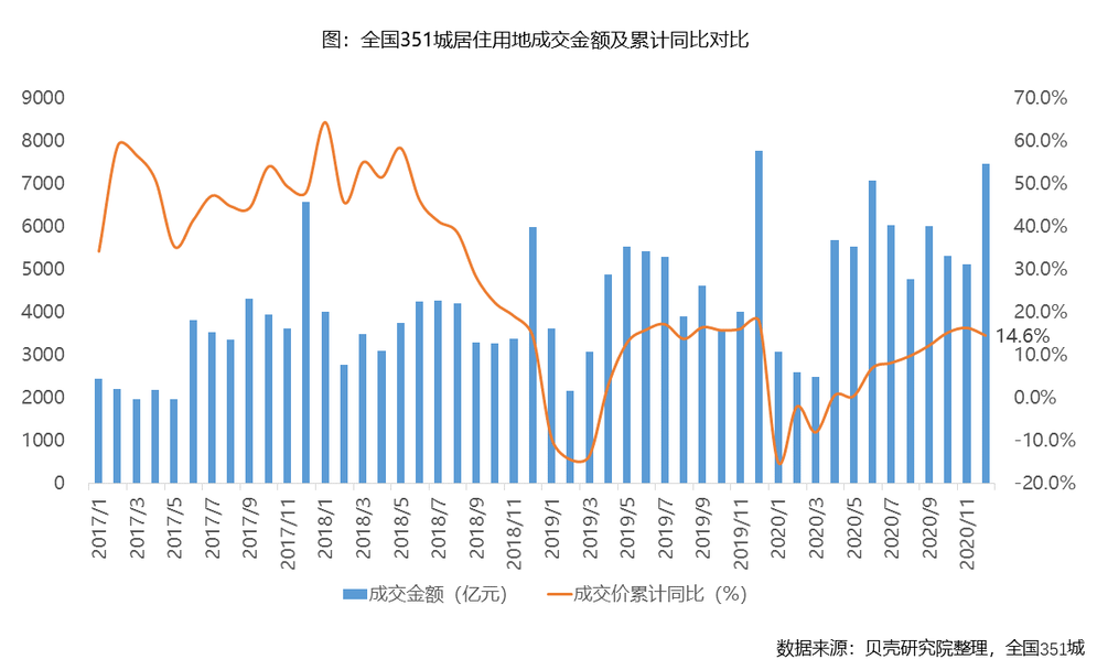 贝壳研究院统计整理数据显示,2020年居住用地成交金额突破6.1万亿元,同比增长14.6%,其中成交规划建面19.4亿㎡,累计同比增长0.3%,追平去年,成交楼面价的增长是促进成交金额增长的主要动力。