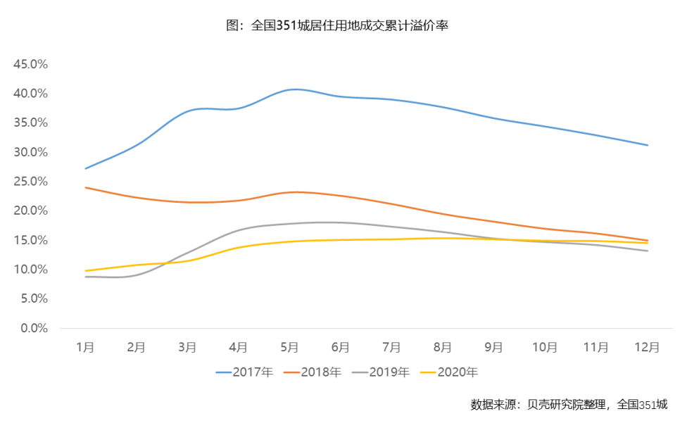 同时,累计溢价率自2017年起开始逐渐收窄,到2020年疫情稳定后,累计溢价率恢复到15%的水平,并保持稳定,土地市场先于新房市场开始回暖,从而带动新房市场逐渐进入恢复期。
