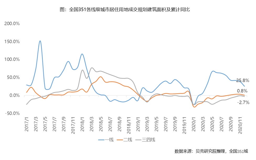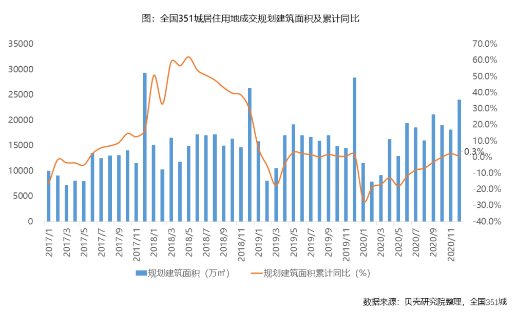 另外,2020年收紧调控政策的33城中,14城提出加大住宅用地供应,预计未来居住用地成交规划建筑面积累计同比增速仍有扩大的趋势。