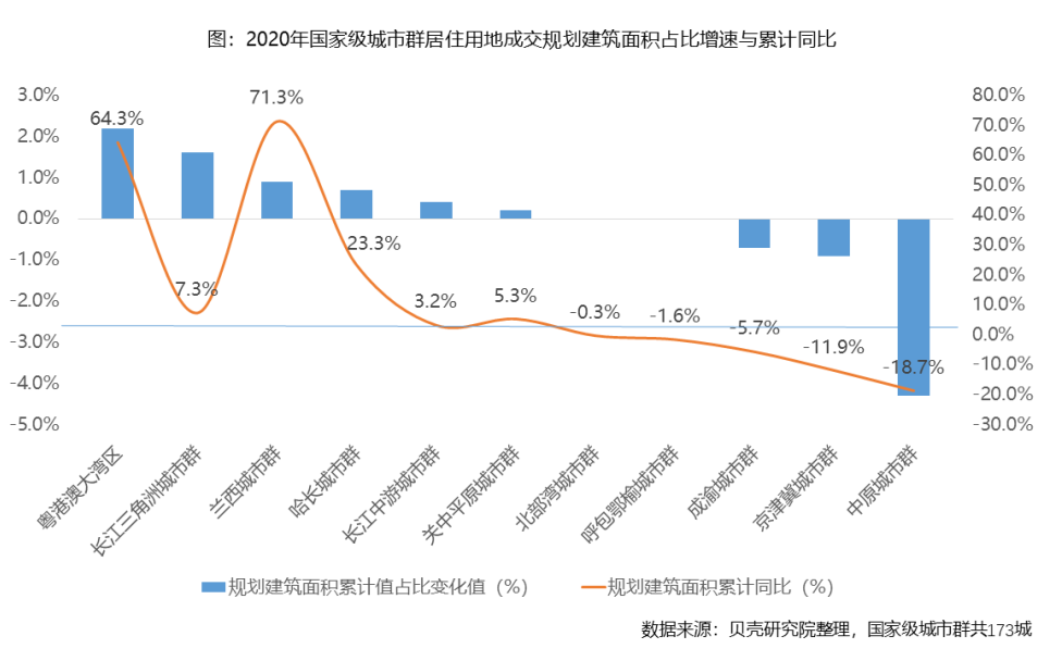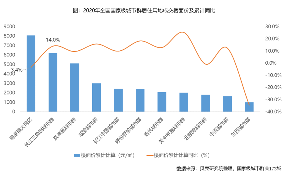 2020年粤港澳大湾区虽然居住用地成交规划建筑面积与成交金额累计同比均有大幅上涨,但整体成交楼面价累计同比下滑3.4%,为少数楼面价下降的城市群之一。