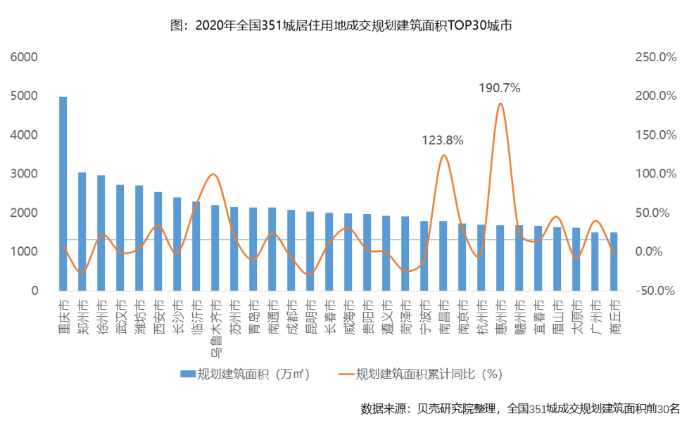 2020年成交的居住用地规划建筑面积排名靠前的主要集中在中西部城市。但在成交面积TOP30城市中,成交面积同比变化情况不一,有11个城市同比下降,郑州、菏泽和昆明下降近三成。而与之相反,惠州同比增长最大,达到190.7%,其次为南昌达到123.8%,乌鲁木齐受城市规划利好拉动,供应量增加,全年成交量同比增长达到99%。在全国总体成交量保持稳定的情况下,城市发展出现分化。