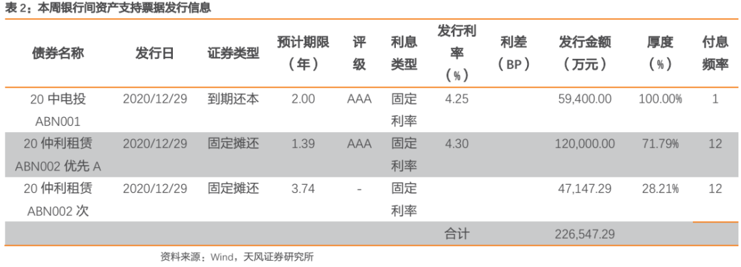 本周共有6期资产支持证券公开发行,总规模79.25亿元。其中,有4期资产支持证券公开发行,总规模56.60亿元;有2期资产支持票据公开发行,总规模22.65亿元。