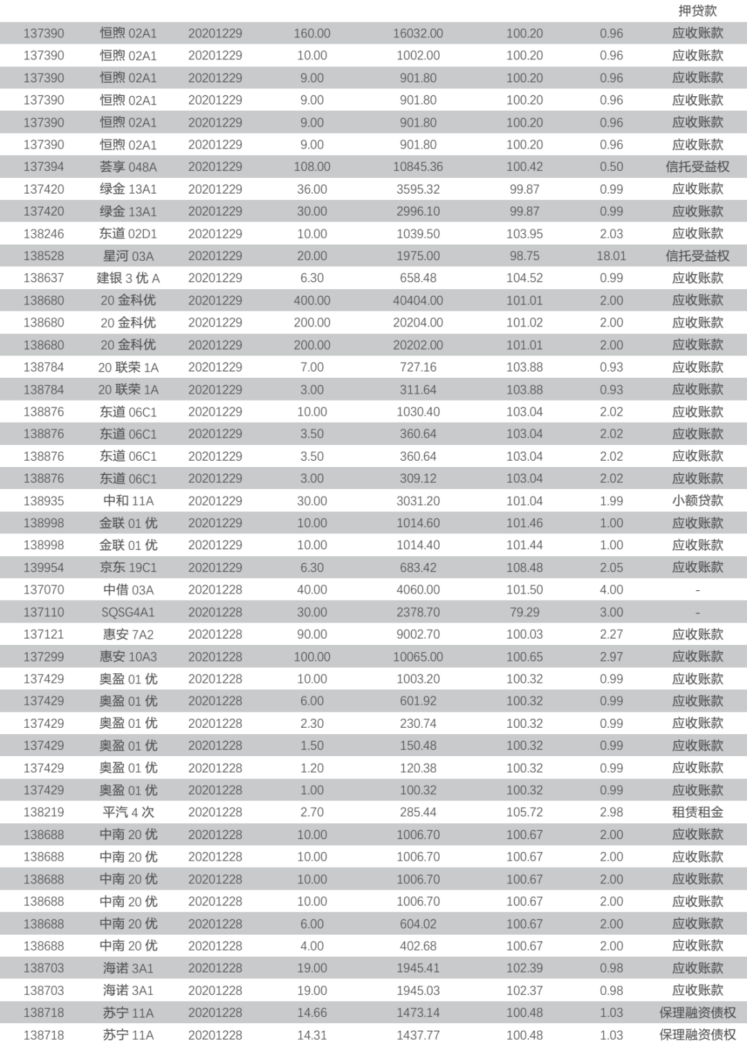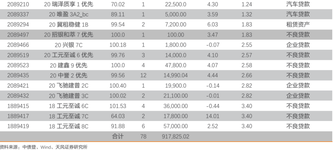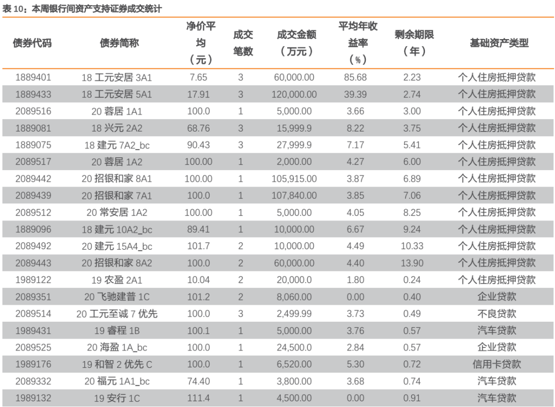 本周银行间资产支持证券成交78笔,成交金额91.78亿元,基础资产包括个人住房抵押贷款、汽车贷款、信用卡贷款、租赁资产、不良贷款和企业贷款。