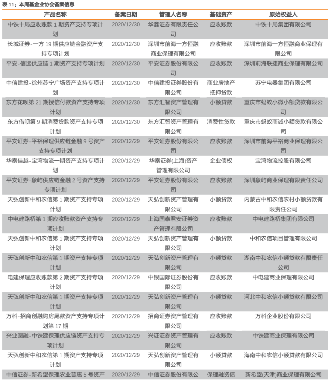 本周有32期资产支持专项计划在基金业协会备案,本次备案产品中,基础资产包括应收账款、小额贷款、保理融资债权、基础设施收费保单贷款、企业债权、商业房地产抵押贷款。
